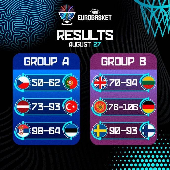 北京时间8月28日,2025年男篮欧洲杯正式开打。在首个比赛日总共有6场对决。